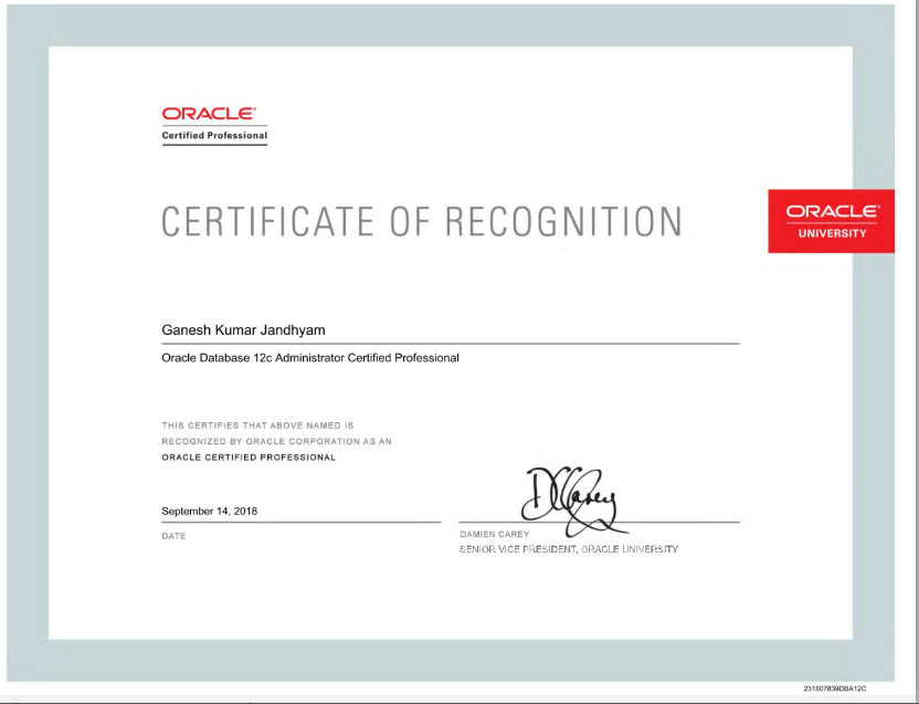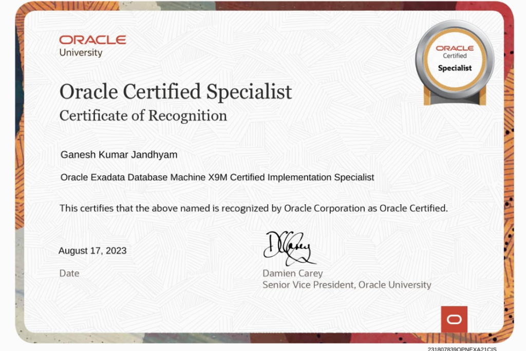 I am Ganesh Jandhyam, an Oracle Database Administrator with hands‑on experience across Oracle Database versions from 9i to 19c and 23ai, including RAC, Exadata, and modern cloud platforms. I specialize in designing, implementing, and managing high‑performance, mission‑critical database solutions across on‑premises and cloud environments.